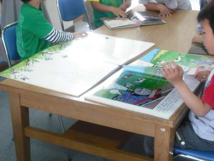 図書室の使い方について勉強した後,本を借りて読みました。読み聞かせ用の大型絵本にびっくりしています。