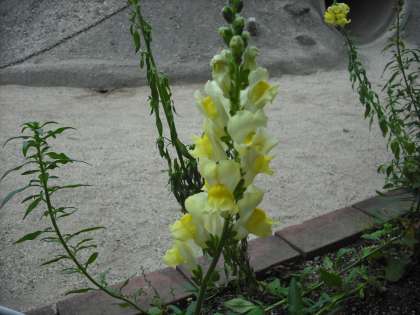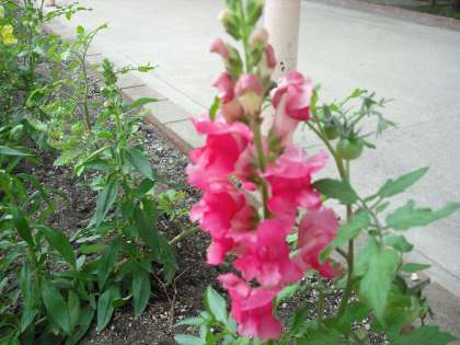 花壇に5色の金魚草が咲いています。写真以外に白・朱色の金魚草があります。