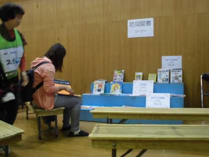 体育館の外では,消火器を使った消火活動が体験できるコーナーがありました。また,舞台上には防災に関する本が置かれ,自由に読むことができました。待鳳社会福祉協議会,待鳳小学校PTA,待鳳学区各種団体,「さくらネット」,佛教大学福祉教育開発センターなど多くの皆さんが,子どもたちのために取り組んでいただきました。