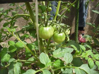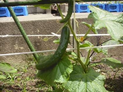 土橋さんと一緒に植えた夏野菜が大きくなってきています。トマトやキュウリが実をつけています。いっぱい獲れるといいね。
