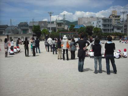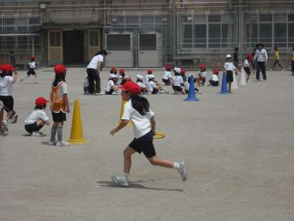 今日は1年生の番です。1年生は,折り返しリレーで男女4チームずつで行いました。保護者の皆さんの参観も多数ありました。