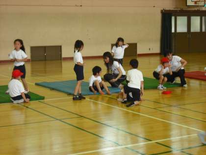 今日は後周りに挑戦です。両手を耳の上の位置につけ,脇をしめて,おしりをかかとから少し遠くにつくようにして,回転のスピードをあげて回ります。うまく回れるかな?