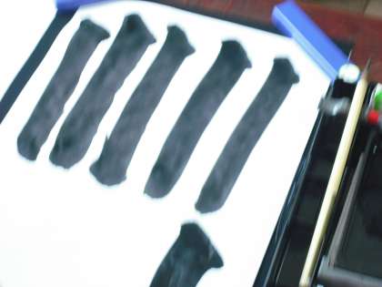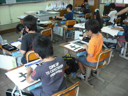 「土」という字を書きますが,その前に「たて画」の練習です。姿勢を正して書くことが大切です。筆を打ち込んでまっすぐひくのですが,慣れないせいか,力加減が強くなったり弱くなったりします。練習していると上手に書けるようになってきます。