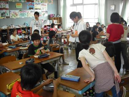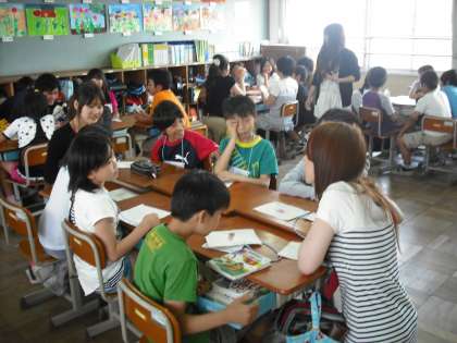 佛教大学との小大連携の外国語活動の2回目です。各学級に学生さんが入って,日本語なしの英語活動です。
