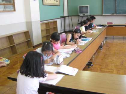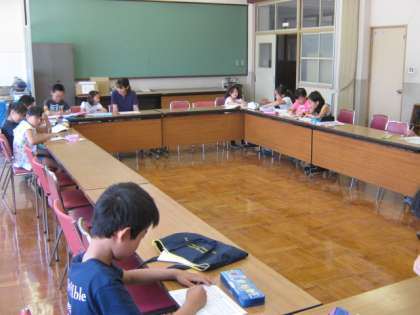 今日は,今年度最初の土曜学習です。朝から子どもたちが,自分の自習課題を持ってきて,会議室で静かに学習しています。先生や学生さんに聞いたりしながら,集中して取り組んでいます。