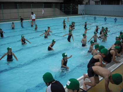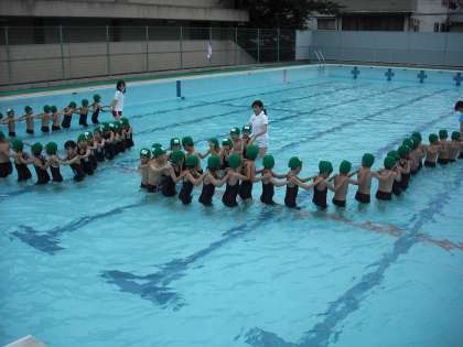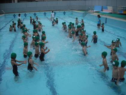 プールでの約束をしっかり聞いて,いよいよ水の中での活動です。向こう側のプールサイドにタッチして戻ってきたり,向かい合わせで水の掛け合いをしたりしました。あいにくの曇り空でしたが,初めてのプールに歓声が上がっていました。