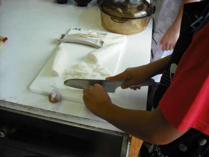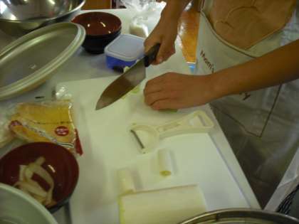 今日はごはんとみそ汁を作ります。去年の調理実習の時に教わった「猫の手」こ気をつけながら包丁を使っています。美味しく出来上がるかな?