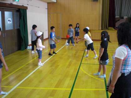 校内オリエンテーリングには,全部で9つのポイントがあり,そこでゲームをしていきます。体育館ではシルエットクイズ(写真 上),パスボールゲーム(写真 中),絵しりとり(写真 下)の3つのゲームです。