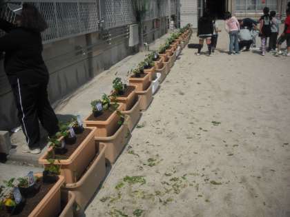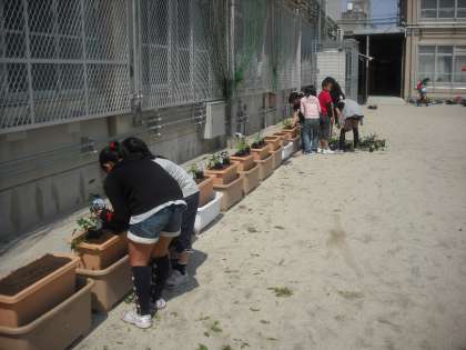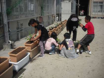 今日も5年生のお友だちと一緒に「緑のカーテン」づくりをしました。プランターを2段にし,宿根の朝顔,ツルレイシ,ヘブンリーブルーを植えました。