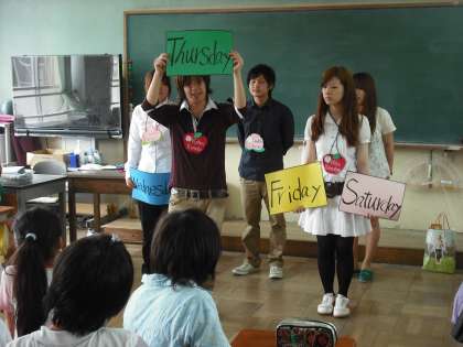 子どもたちがとても楽しみにしている佛教大学の西岡ゼミの学生のみなさんとの外国語活動の3回目です。今日も日本語は禁止です。と今まで学習してきたことに加えて,今日は曜日の学習もしています。5時間目にはフェリシティ先生も来られます。