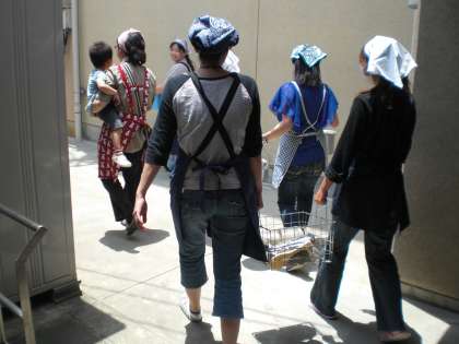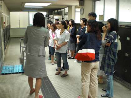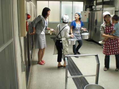 吉田先生のお話に引き続き,給食室の見学をしています。みなさん大きな釜にびっくり!つぎは給食の配膳体験です。