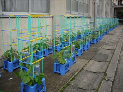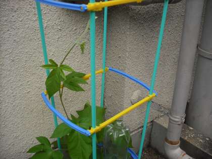土日でずいぶん成長しました。友だちのあさがおとツルが絡まないように支柱を立てました。