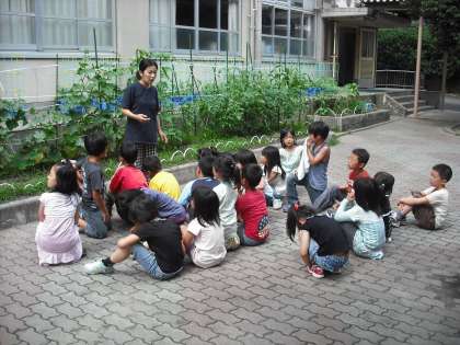 土橋さんと一緒に植えた野菜が大きく成長しています。今日はその成長ぶりを観察していますが,いつもよく見ているのでしょう。土日の間にトマトやナスビが鳥に食べられたところもすぐわかりました。