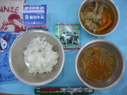 今日の給食のメニューは,むぎごはん・鶏肉と野菜のオイスターソース炒め・はるさめスープ・牛乳・黒大豆です。今日も残さず,おいしく食べましょう。