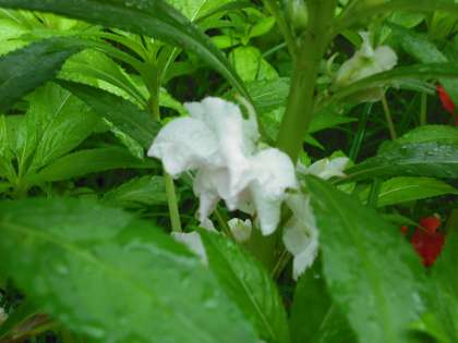 花壇に植えたホウセンカが赤やピンクの花を咲かせ始めました。
