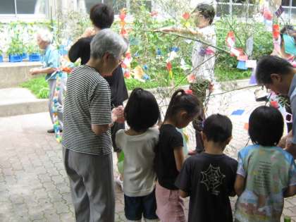 今日は七夕です。1年生は,きのう教室で作った短冊やかざりを,すこやか学級の皆さんと一緒に笹につけました。すこやか学級の皆さんに作っていただいた「こより」を使って,かざりをつけました。