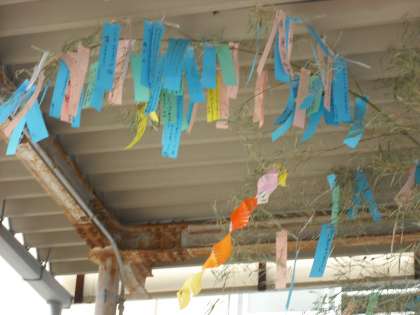 1年生や2年生は学年で笹かざりを作りましたが,全校では作っていません。そこで,玄関に竹をおいて,子どもたちが自由に願い事を飾れるようにしました。願い事の中には「サッカーが上手になりますように」「家族が健康で過ごせますように」「テストで100点をとれますように」など,たくさんの願い事が書かれています。中には,「お母さんに怒られませんように」という短冊もあり,素直な気持ちが書かれていました。みんなの願い事がかないますように!