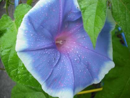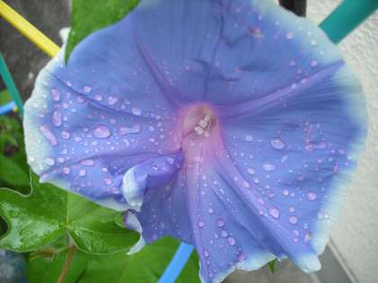 今朝から降りだした雨に,アサガオの花がぬれて,水滴のついたところが色の変化を起こしています。アサガオの色を作り出しているアントシアンという化学物質が,酸性雨のために変化を起こしたようです。酸性雨による被害は世界各地で報告されていますが,身近なところでも感じられます。地球にやさしい環境について,みんなで考えていかなければなりませんね。