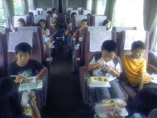 車内ではゲームをしたりして過ごしていますが,少し早い昼食タイムです。賢島には12時到着予定です。