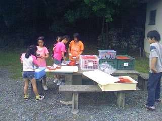 所内の散策を終え,入浴も済ませたら夕食です。英虞湾と太平洋をつなぐ深谷水道に面した屋外のテーブルで夕食です。グループで協力して準備し,みんなで「いただきま〜す。」
