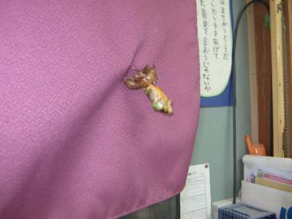 北校舎入口の階段に,生きたセミの幼虫がいました。抜け殻はよく見かけますが,生きた幼虫を見つけるのはなかなかありません。理科で昆虫の学習をした3年生の教室で,テレビのカバーにつけて様子を観察しました。すると羽化を始めました。とても貴重な機会でした。