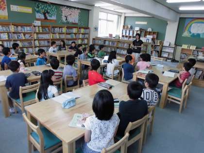 図書館の本は,種類ごとにラベルが貼ってあります。本の探しやすさやよさを感じながら,子ども達は,しっかりと話を聞いていました。