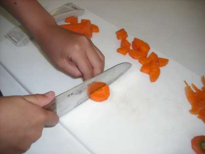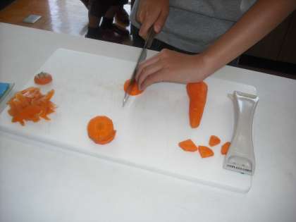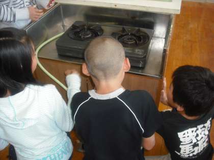 今日は,これから始まる調理実習を前に,ガスコンロや包丁の安全な使い方について学習しました。最初はこわごわでしたが,だんだんとうまくできるようになりました。包丁では「猫の手」をしっかり守っています。