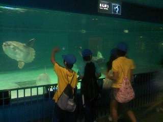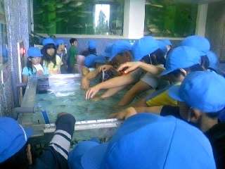 昼食後,マリンランドの見学再開です。手を入れると寄ってくるドクターフィッシュやマンボウなど,いろいろな海の生物をグループごとに見て回りました。見学が終われば,京都へ向けて出発です。