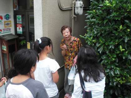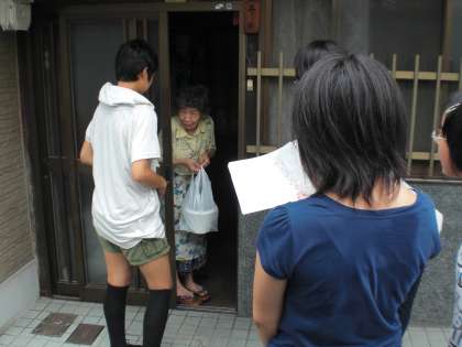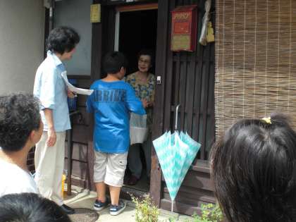 地域のお年寄りのお宅を順番に回って,お花を届けています。わたす時の口上もしっかり言えたようです。