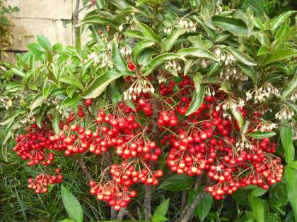 「マンリョウ(万両)の赤い実と白い花が一緒に」