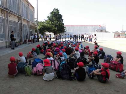 4年生の宿泊学習「みさきの家」の朝を迎えました。晴天に恵まれ,4年生61名全員参加での出発式。「友達やみんなと協力し,思い出に残る楽しい3日間にしよう!」の目標目指して,元気に出発しました。