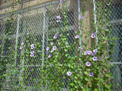 宿根のアサガオがいっぱい咲いています。少し遅れてまいたヘブンリーブルーもこれからツルが絡んでくることでしょう。