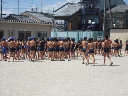 夏休み初日,最初のプール学習は高学年です。朝から気温が急上昇中。たくさんの子どもたちが参加しています。みんな気持ちよさそうに泳いでいます。