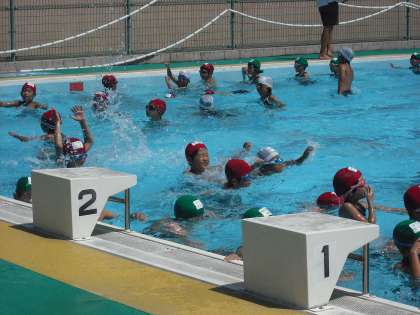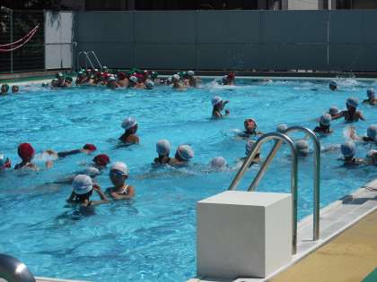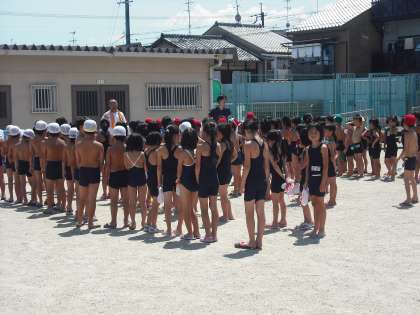 午後からは低学年です。1時現在の気温は35度,猛暑日です。絶好のプール日和,たくさんの子どもたちが参加しています。みんな気持ちよさそうに泳いで(浮かんで)います。