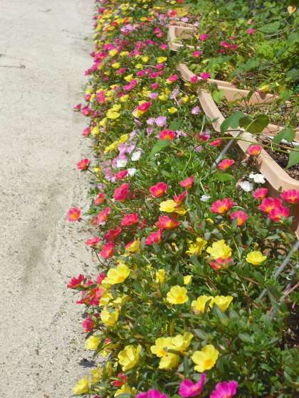 緑のカーテンのプランターの1段目にポーチュラカを植えています。いろいろな色のポーチュラカが咲き誇っています。