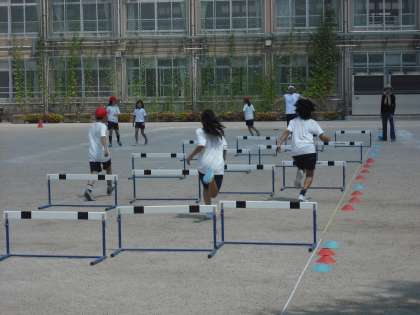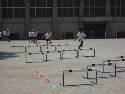 今日は運動場がサッカーと同時使用なので,ハードル走の練習です。