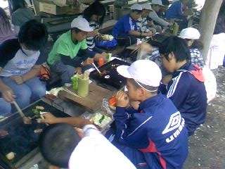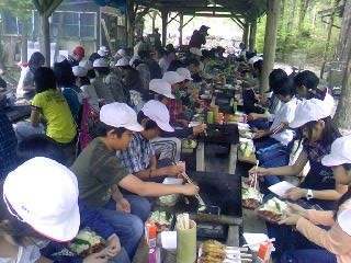 待ちに待った昼食です。メニューは野外バーベキュー。空腹にはこたえられませんなあ。やっぱりお肉はおいしいなあ。みんないっぱい食べようね。この後,森林鉄道に乗ったり森林資料館を見学したりお土産を買ったりします。