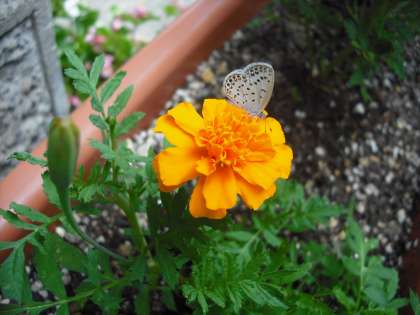 夏を代表する花の一つ,マリーゴールドにシジミチョウがとまっています。シジミチョウも暑さでひと休みかな?