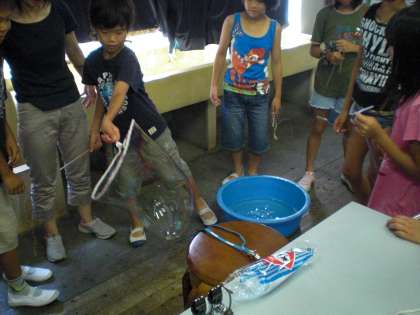 4年2組に引き続き1組の登校日もジャンボしゃぼん玉です。大きいしゃぼん玉ができるよう特殊なしゃぼん液をつくり,モールの枠でしゃぼん玉をつくります。うまくできたかな?