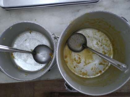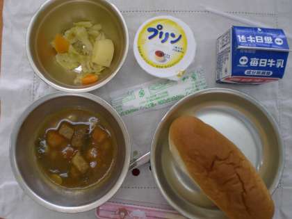 今日の献立は,味付けコッぺパン・牛乳・大豆と豚肉のカレー煮・野菜のホットマリネ・プリンです。おいしくいただきましょう。あらまあ!完食〜っ!!