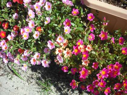 緑のカーテンのプランター1段目に植えてあるポーチュラカが見事に咲いています。