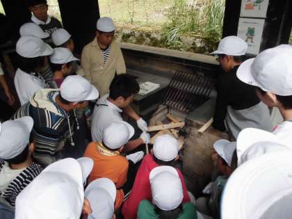 今日の夕食は野外炊事で豚汁とご飯を作ります。まずは山の家の所員さんからいろいろ教えてもらい,その後,かまどでどうすればよく火が燃えるか自分たちで考えチャレンジしました。