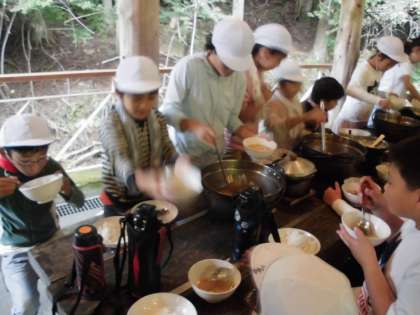他の班の味はどうかな。食べてみたい。先生にも自分の班の豚汁をすすめていました。