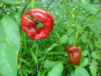 万願寺トウガラシが熟して赤くなっています。熟した万願寺とうがらしは甘くて,焼いても煮てもおいしいですよ。