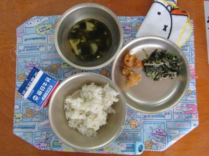 今日の献立は,麦ごはん・牛乳・たらのこはくあげ・ほうれんそうともやしのごま煮・若竹汁です。今日も残さず,おいしくいただきましょう。