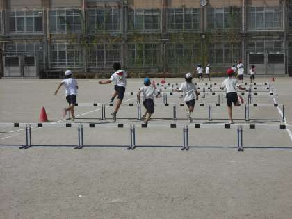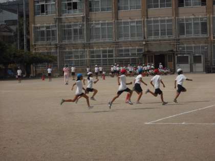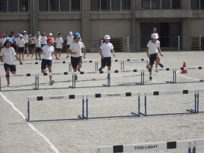 今日は100m走とハードル走の個人走の練習です。5時間目の暑い中ですが,水分を補給したり,影に入ったりして,暑さ対策をしながら,練習を頑張っています。