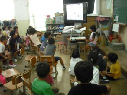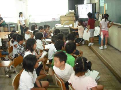 今日は自由参観日です。1年生では,「夏休みの楽しかったこと」を絵日記に表して発表会をしています。