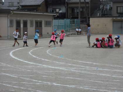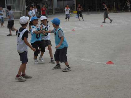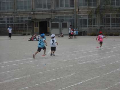 給食前の時間を利用して低学年のリレー練習です。バトンは棒ではなく,渡すときに落としにくいように輪っかのバトンを使用しています。本番では何色が勝つかな?