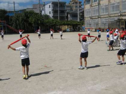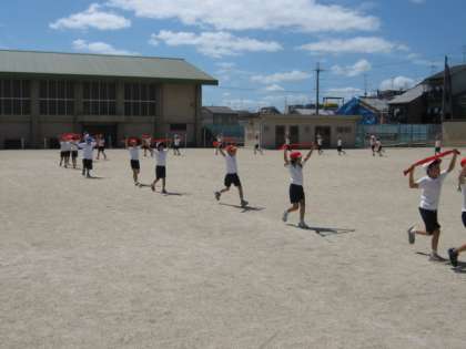 運動場で音楽に合わせて初めて練習しました。位置を確認して,踊りの動きやポーズの姿勢を決められるよう練習しました。赤い布を持って,船を漕ぐ様子を表現します。本番をお楽しみに。