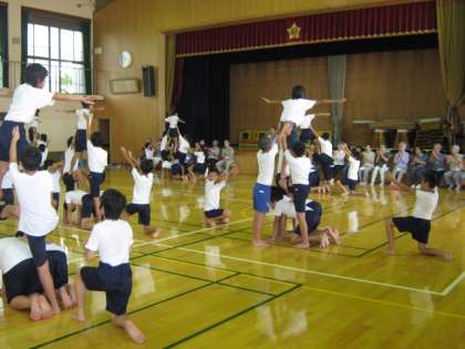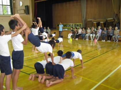 今日のすこやか学級は,6年生が組体操を披露しました。体育館へお年寄りの皆さんをお招きし,見ていただきました。一人技から始まり,最後は全員での大技まで,今までの練習の成果を出すことができました。運動会本番までにすこやか学級の皆さんが一番に最後の大技を見ることができました。保護者の皆さんは当日を楽しみにしていてください。すこやか学級の皆さんからは,惜しみない拍手をいただきました。本番でもがんばりたいと思います。